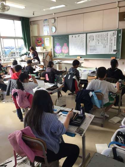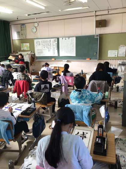 3年生の書初め大会の様子です。「げんき」を書いています。