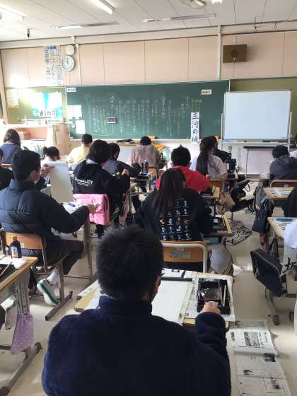 6年生の書初め大会の様子です。「三河の城」を書いています。