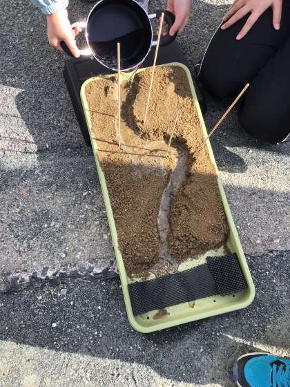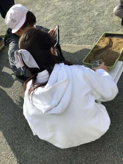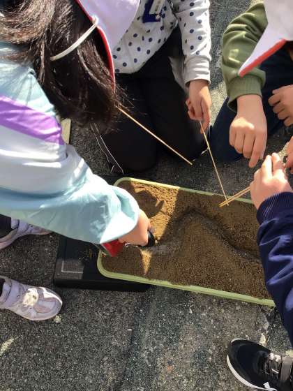 5年1組の授業の様子です。流れる水のはたらきについて、小さな川を作って調べました。全員が真剣に実験に取り組むことができました。