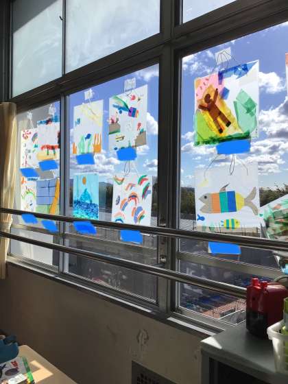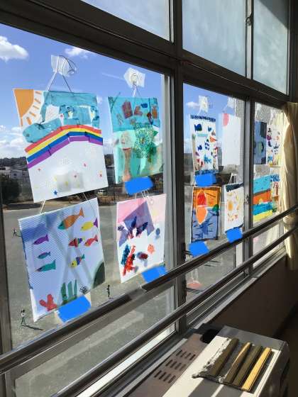 4年1組の教室に入ると、子どもたちの素敵な作品が飾ってありました。図工の時間に作成したものとのことです。光がきれいに差し込み、美しく輝いています。2組でも掲示されています。授業参観で見ることができますので、保護者の方は、子どもたちの頑張りをぜひご覧ください。