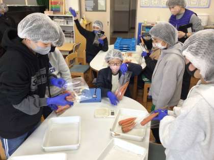 JRC委員会は地域の無門会の協力を得て、明日市場に出荷される人参の袋詰め作業を体験をしました。無門会の収入に繋がるので、子ども達も真剣でした。