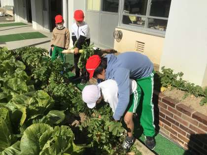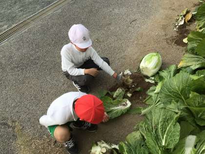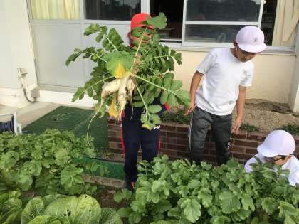 地域の栽培ボランティアさんより苗をいただいたり、何度もアドバイスに来ていただいたりしたおかげで、今年も立派な白菜や大根が収穫できました! 無農薬なので味も最高。「甘くて美味しかった」「野菜嫌いの子も食べられた」と大好評でした。