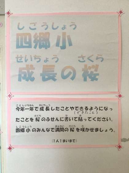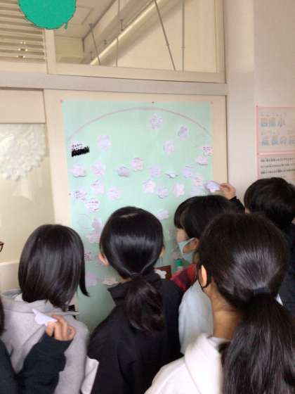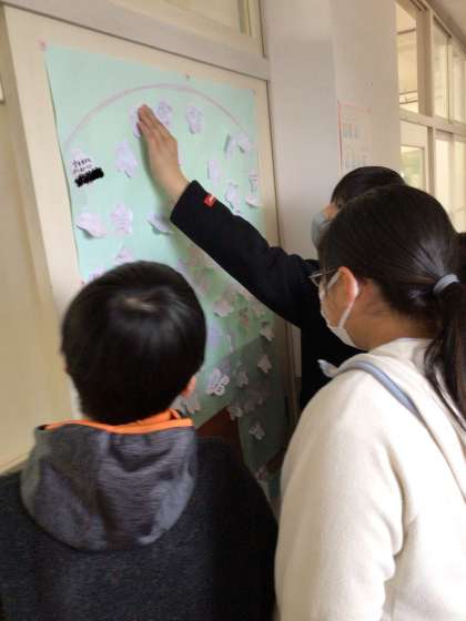 保健室前で、1年間の成長を振り返る取組をしています。「6年生になって四郷小を引っ張ることができました。中学校でもできることを増やしたい」「1年生と仲良くできた。卒業まであと少しなので、1から5年生とたくさん遊ぶ」「英語がわからなかったけど、授業をやったら少しわかるようになった」など書いてありました。お互いに成長したところを認め合えるのは素敵ですね。