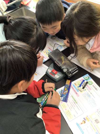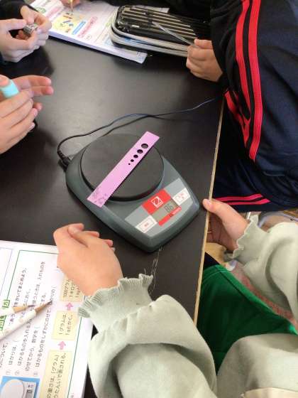 3年2組の授業の様子です。「ものの重さ」の単元を学んでいます。身の回りのものの重さを電子てんびんではかりました。目を輝かせて実験に取り組む子どもたちの姿が見られました。