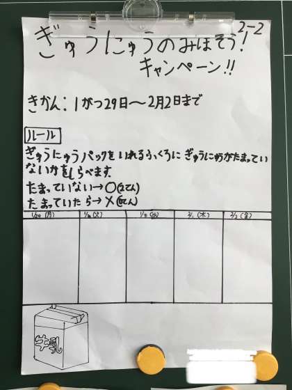 今日から1週間、「牛乳飲みほそうキャンペーン」を行なっています。牛乳をきれいに飲みほすことを目的に実施しています。片付けの袋に牛乳がたまらないようにしていきましょう!