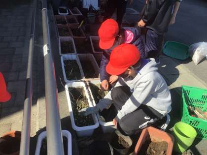 3年生のときから大切に育ててきたどんぐりの木。いよいよ来月、博物館に寄贈しに行きます。一人1鉢、持ち運びやすいように、植えかえています。