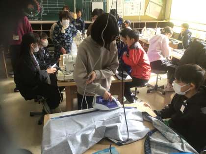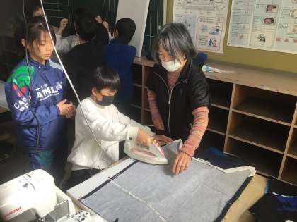 今日はいよいよエプロンを作り始めました。布を裁ち、縫う前にアイロンをかけたり、まち針をさしたり…ミシンを稼働するまでにやるべきことがたくさんあります。初めてのアイロンがけで緊張しましたが、8名ものボランティアの方々がお手伝いくださり、みんな上手にかけることができました。