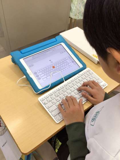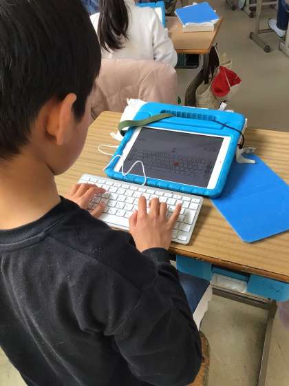 3年2組の授業の様子です。ICT支援員の方に来ていただき、授業のサポートをしてもらいました。3年生は、ホームポジションを教えてもらうなど、タイピングについて学びました。