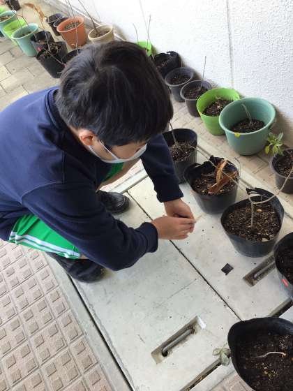 4月にオープンする博物館のコンセプトは、「みんなでつくりつづける博物館」です。そのコンセプトに沿った活動として、四郷小で育てたどんぐりの植樹を2月26日に行います。その準備を6年生がしていました。