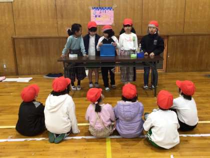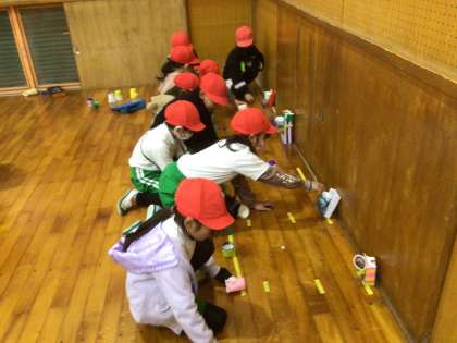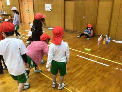 2、3時間目、体育館で1年生を招待して開きました。2年生がゲームの説明をしてから開始。どこも大盛り上がり。ミニバスケット、アニマルボーリングの様子