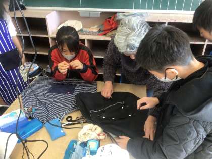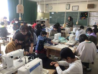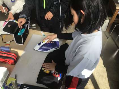 今日はエプロン製作最後の日です。ポケットをつけています。みんなしつけ縫いに苦戦中。かっこよくできあがるかな?