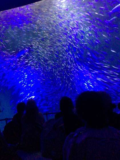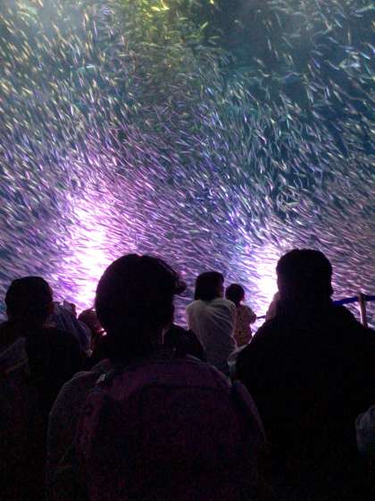 マイワシのトルネードの様子です。約3万5千匹のマイワシの美しさを見ることができました。また、食物連鎖に関連した話を聞き、マイワシの習性についても学びました。生物についても学ぶ充実した時間になっています。