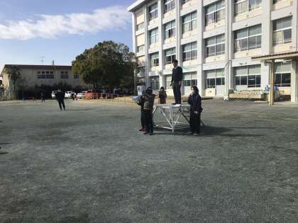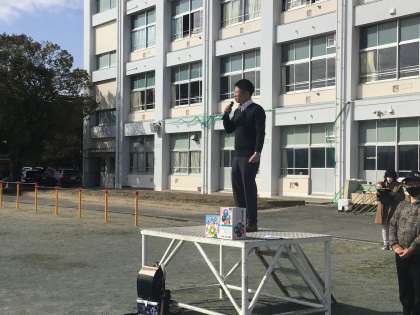 あいさつ運動の表彰後、資源回収の収益で購入したバランスボールとボッチャをPTAから寄贈しました。その後、PTA会長からあいさつをしました。寄贈されたものを大切に使っていきます。