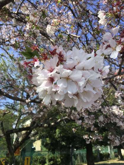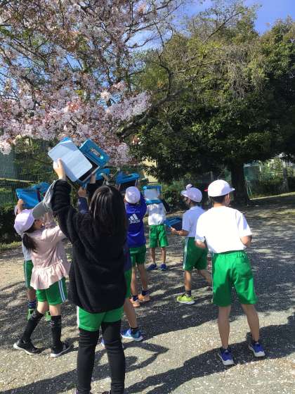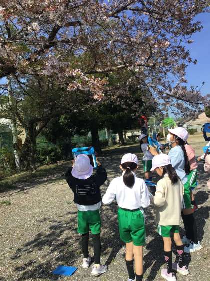 4年3組の理科の授業です。身近な生物を観察し、学習用タブレットで写真を撮りました。4年生は、1年間の生物の変化を観察していきます。きれいな桜に癒されました。