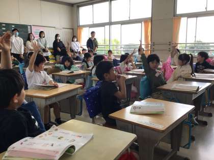 1年1組は、国語の授業で「う」と「え」で始まる言葉を発表していました。
