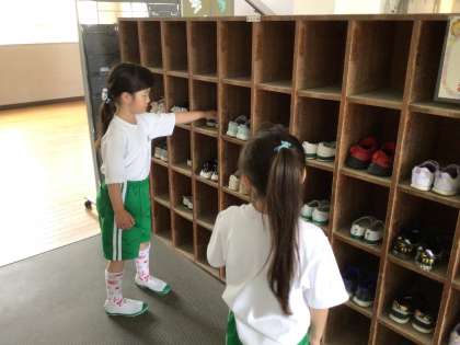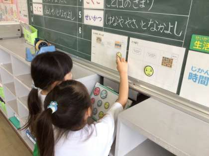 整とん係の子は、靴箱やトイレのスリッパの整とんをチェックして、各学級にあるボードで結果をお知らせしています。毎日の活動の積み重ねで、整とんを意識する子が増えてきました。