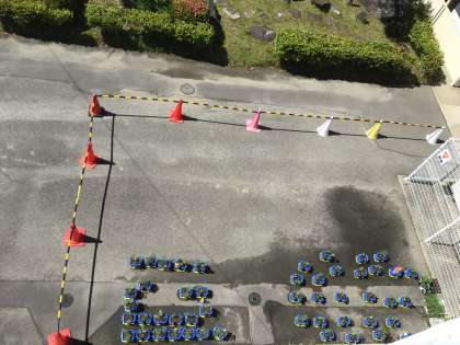 理科室と体育館の間に鉢が並んでいます。駐停車はご遠慮ください。歩行者の通路も狭くなっています。ご協力よろしくお願いします。