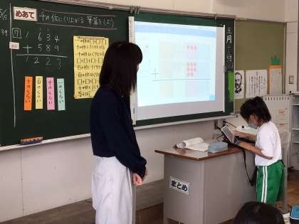 一の位から順に声に出したり、学習用タブレットで操作したりして、解を求めました。合して10を超えると左の位に1増やすことができました。