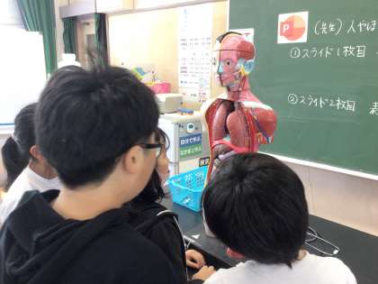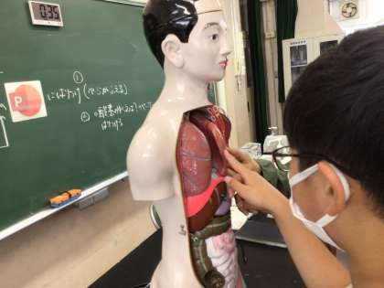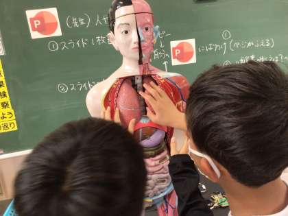 6年2組の授業の様子です。肺のはたらきについて学び、人体模型で肺の形や大きさ、場所について確認しました。