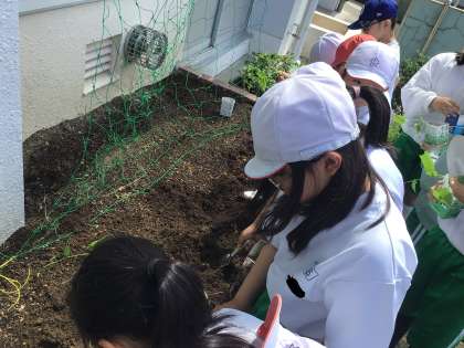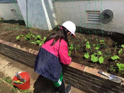 4年2組の授業の様子です。教室で大事に育てたツルレイシを外の花壇に植えました。これから外で育て、緑のカーテンにしていきます。