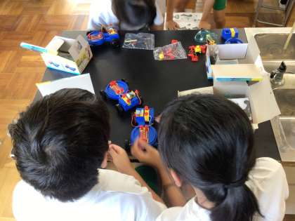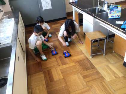 4年2組の授業の様子です。「電池のはたらき」の単元のまとめとして、より速くモーターカーを走らせようと試行錯誤しながら取り組みました。直列、並列回路について理解を深めることができました。