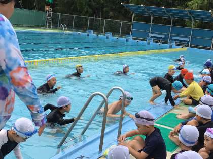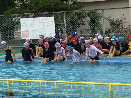 3クラス一斉に練習しました。担任のホイッスルに合わせて、水慣れや伏し浮きをしました。