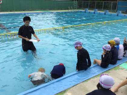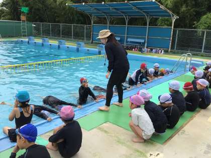 クラスごとに分かれて、顔をつけたり、浮いたりしました。顔をつけるのも怖い子から、バタ足ができる子までいろいろいましたが、どの子も楽しそうでした。