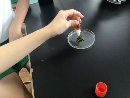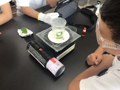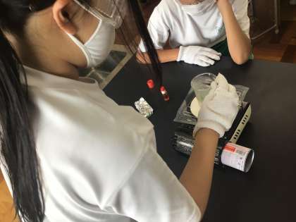 6年2組の授業の様子です。ヨウ素液を使って、葉にデンプンがあるか調べました。安全に気をつけながら、実験に取り組むことができました。