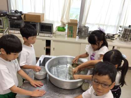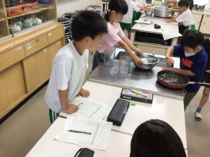 調理室で、いろいろな水の量を計量カップで計りました。