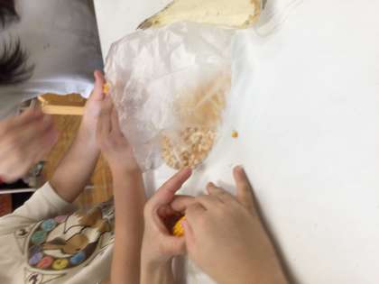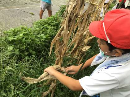 春に植えたとうもろこしが収穫の時を迎えました。次の誕生日会で、ポップコーンを作ります。子どもたちもとても楽しみに、一生懸命に収穫しました。たくさん収穫できてよかったです。