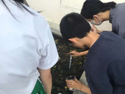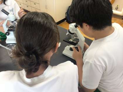 理科の授業の様子です。顕微鏡を使って、メダカ池の微生物やミジンコのプレパラートなどを観察しました。メダカ池の微生物をみて、驚きの声をあげるなど、意欲的に観察することができました。