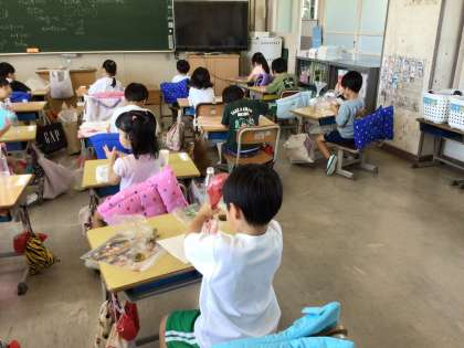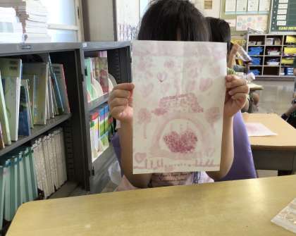 アサガオの花で色水遊びをしました。色水で絵を描いたり、折り染めをしたり楽しく活動ができました。