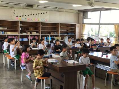 いろいろな楽器を使って「たぬきのたいこ」のリズム打ちをしました。