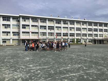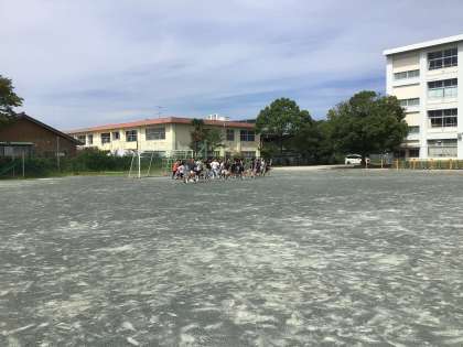 6年生のドローン撮影の様子です。全力ダッシュと全力帽子投げ!