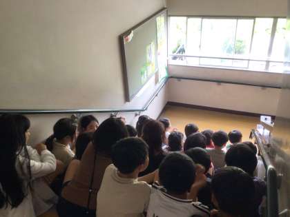 4年生のドローン撮影の様子です。階段にきれいに座って撮影していました。