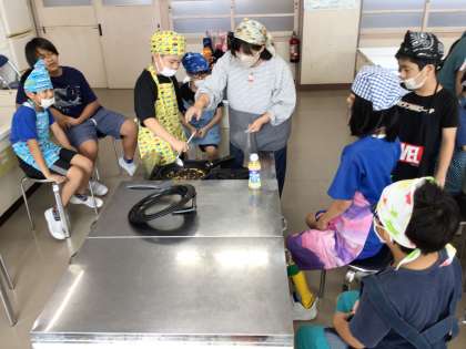 洗った食器を拭いたり、ガスを付けたり、油を入れたりと、それぞれの学年で役割分担して作りました。食べて一言「苦い」「味がない」いつか再チャレンジですね。