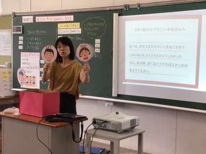 研究授業「友だちともっと仲よくなろう」子ども達はすごろくをして心をほぐし、2つの場面でのよい関わり方を一緒に考えました。授業の最後には、一人一人がめあてを決めて、一週間後に振り返ることになりました。