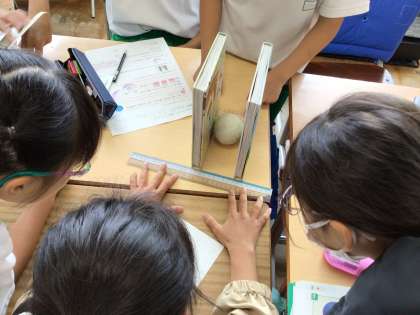 球の直径や半径の長さをグループで調べました。しっかり立つもので挟んで計りました。