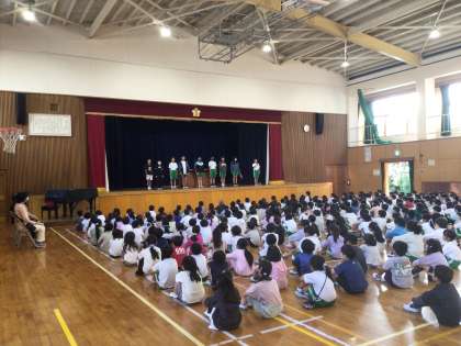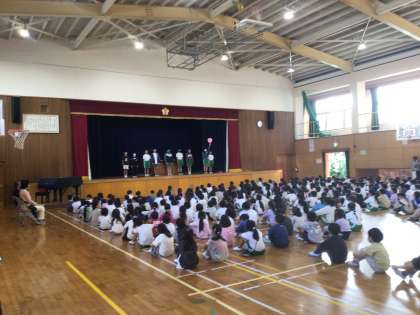 代表委員会の進行により、各委員長の意気込み、6年生の修学旅行のまとめ発表を行いました。