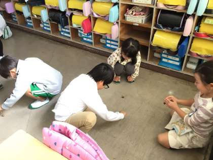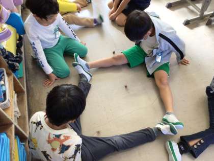 生活科の学習で、どんぐりごまを作って遊びました。つまようじの長さや回し方のコツを考えながら遊ぶことができました。