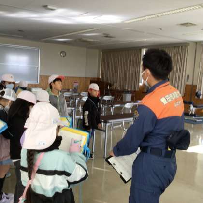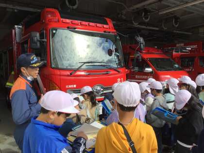 北消防署に見学に行きました。施設の中には、事務室、食事室、仮眠室、学習室(トレーニングルーム)などあり目を輝かせて見て来ました。たくさんの質問にもとても親切に答えてもらいました。