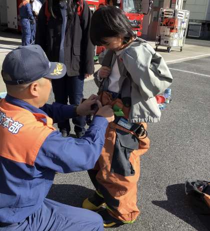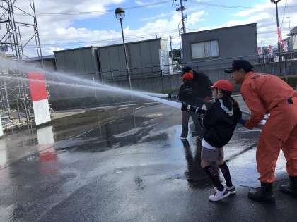 消防署では、放水の体験をさせてもらったり、防火服を着させてもらったりしました。見学や体験を通して、消防士さんの仕事や大変さを実感することができました。