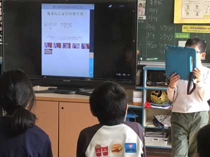 畑で育てたさつまいもを使って挑戦しました。作り方をスライドを使って説明をしてくれたおかげで、みんな失敗せずに作ることができました。お家でも作ってみてね。