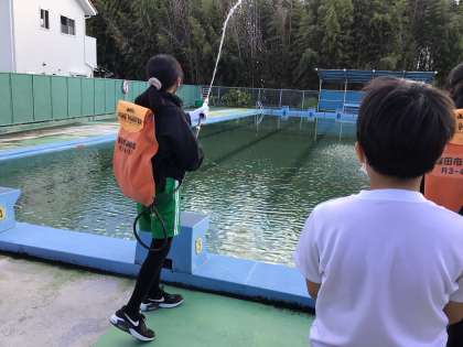 消防本部の方と消防団の方々に来ていただき、水利の学習と放水体験をしました。