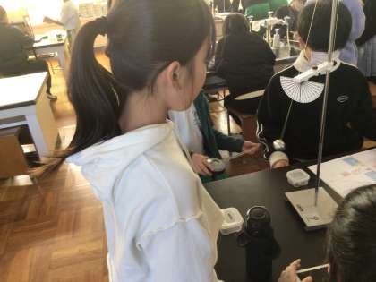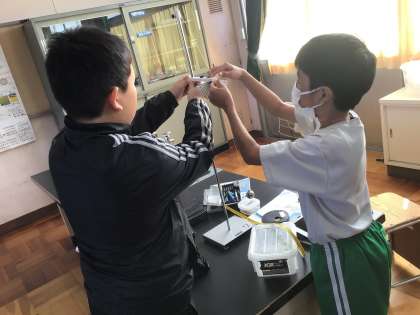 5年2組の授業の様子です。「ふりこの性質」の単元を学んでいます。今日は、条件を整えながら実験をしました。班のなかまと協力して取り組む様子が見られました。