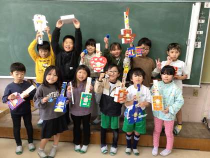 図画工作「音づくりフレンズ」の学習で、すてきな楽器を作りました。みんなで演奏したら、楽しそうです。