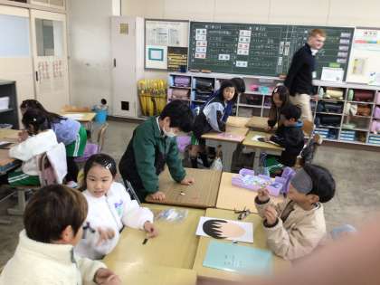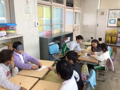 英語で上、下、右、左を復習しました。次に目、鼻、口、眉毛、耳、髪の毛の英語の言い方を学びました。そして、顔のパーツを渡し“hair.”と伝え、“down”など場所を伝えました。みんな時間内に顔ができるように協力しました。
