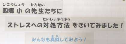 1階廊下の掲示板に先生たちのストレス対処方法を掲示しています。四郷っ子は、いいなと思うものをマネしてみましょう!