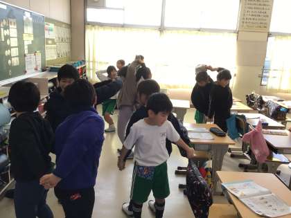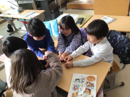 音楽の授業で、わらべ歌を歌いながら遊びました。「ずいずいずっころばし」や「なべなべそこぬけ」をみんなで楽しく行いました。