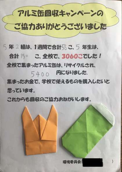先月のアルミ缶回収へのご協力ありがとうございました。たくさんのアルミ缶が集まり、多くの収益金を得ることができました。この収益金を使って何を購入するか、現在子どもたちにアンケートをとっています。子どもたちの学校生活に役立てていきます!
